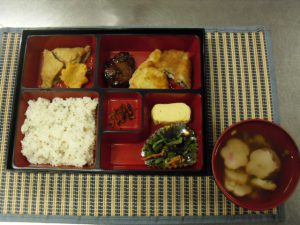 本日のメニュー ♪誕生日会♪<松花堂弁当> ◇梅菜飯 ◇すまし汁 ◇アジしそ巻きフライ ◇さつま芋天ぷら ◇肉団子 ◇厚焼き卵 ◇炊き合わせ ◇からし菜おかか和え ◇漬物