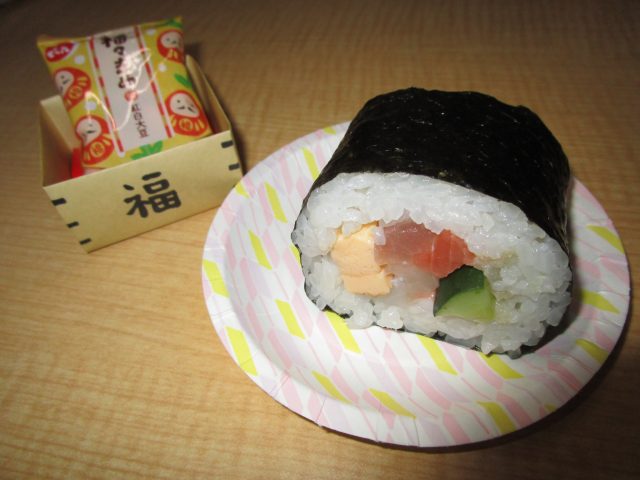 後半は節分の豆と恵方巻をみなさんでいただきました。今年の恵方巻は南南東!恵方巻を食べて今年一年の無病息災を願いましょう。