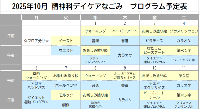 皆さんこんにちは。精神科デイケアなごみです。10月のプログラム表を掲載いたします!