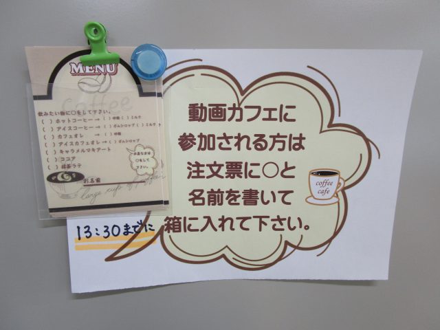 この注文票にひとりひとり飲みたいものに〇をつけてBOXに入れるというシステムです。もちろん飲み物もおしゃれな耐熱紙カップとマドラーをつけてメンバーの皆さんにお出ししています♪雰囲気だけでもすこしカフェ気分を味わっていただけているといいな~と思います!