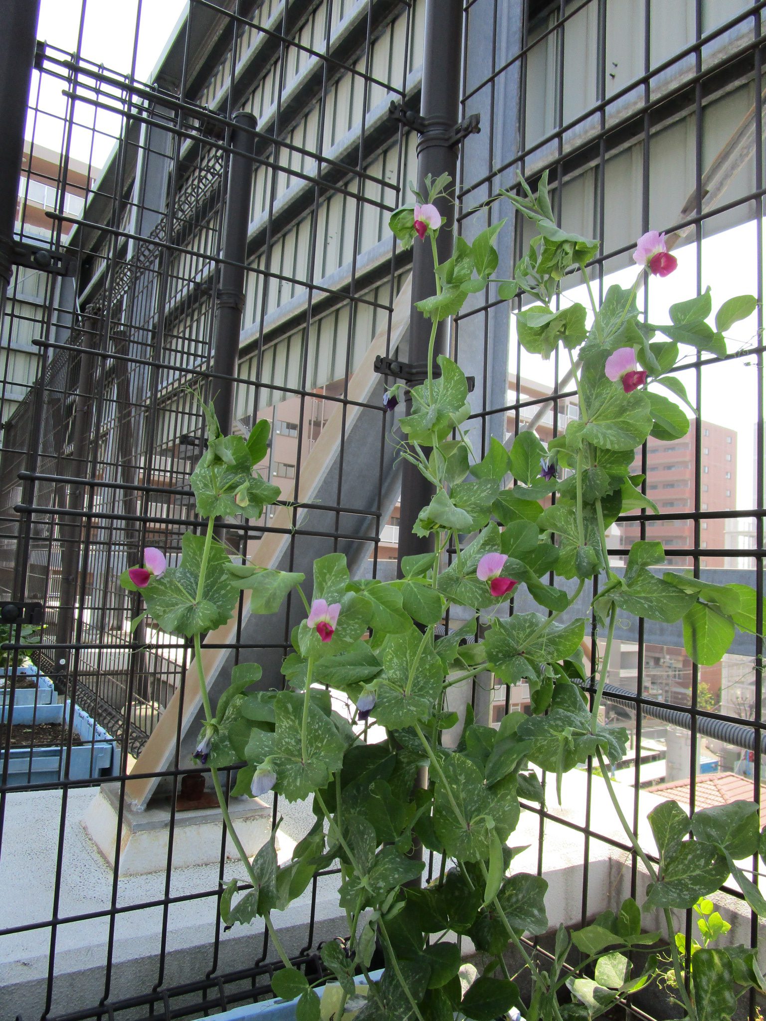 他の野菜よりも一足先に植え付けをしていた絹さやは、芽が出始めたころ葉っぱを鳥に食べられてしまい元気がない状態だったのですが、ここ最近はこまめに水やりをしたところとても元気に成長しています!