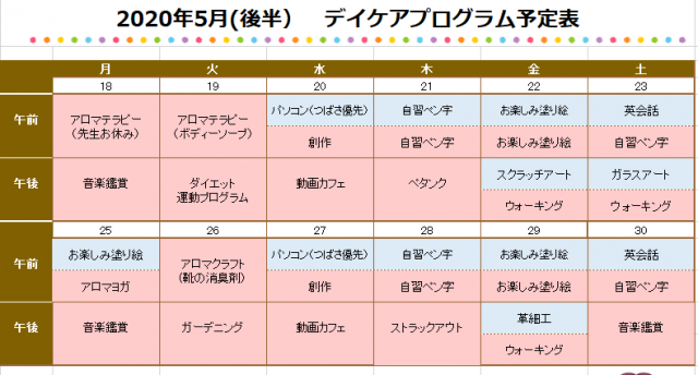 さて、5月後半のプログラム表が完成したので掲載します。なかなか状況が変わらず、講師プログラムが減っている状況ではありますが、少しでもメンバーの皆さんに有意義な時間を過ごしてもらえるといいなと思いながら考えました。
