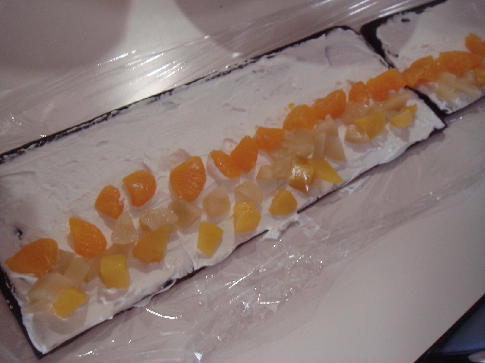 各グループの作業終了後に、泡立てた生クリームとカットした缶詰の黄桃・白桃・みかんをスポンジにのせて、掛け声と共に長いスポンジを一斉に巻きました!