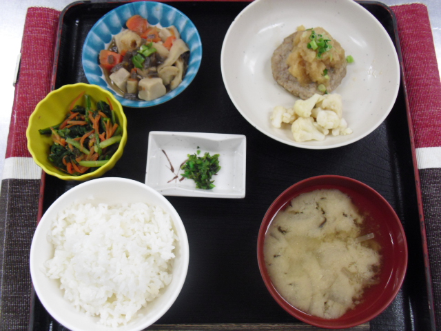 ◇御飯 ◇味噌汁 ◇和風ハンバーグ ◇高野豆腐煮物 ◇小松菜お浸し ◇しその実漬