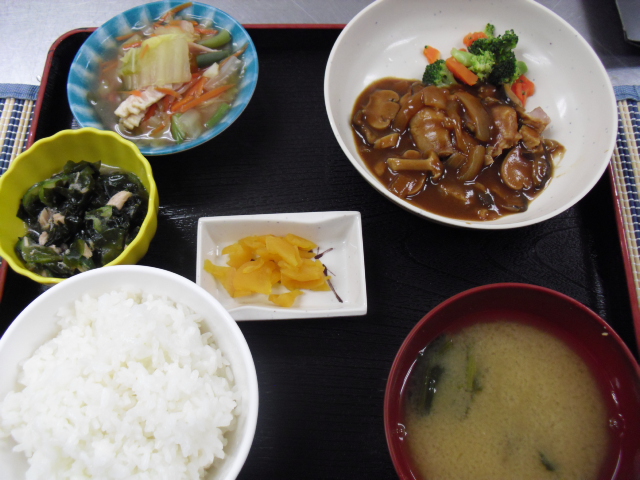 ◇御飯 ◇味噌汁 ◇鶏肉ときのこのデミグラスソース ◇白菜とベーコンのスープ煮 ◇わかめとツナの和え物 ◇つぼ漬