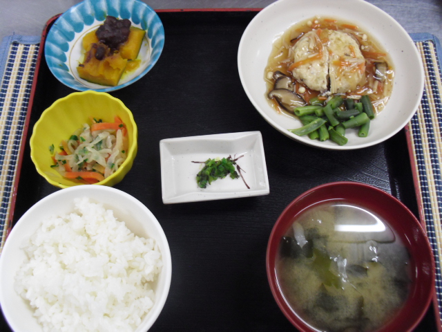 ◇御飯 ◇味噌汁 ◇豆腐ハンバーグ野菜あん ◇南瓜のいとこ煮 ◇にらのナムル ◇しその実漬