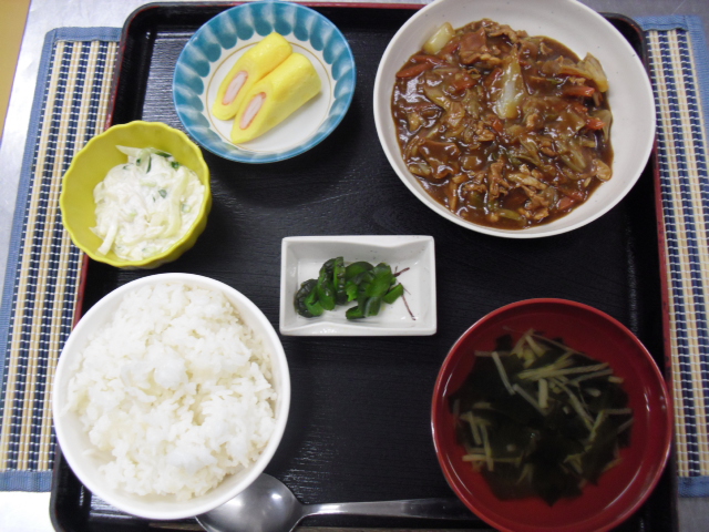 ◇御飯 ◇すまし汁 ◇豚肉とキャベツの味噌炒め ◇かにかま卵ロール ◇大根のマヨネーズ和え ◇青かっぱ
