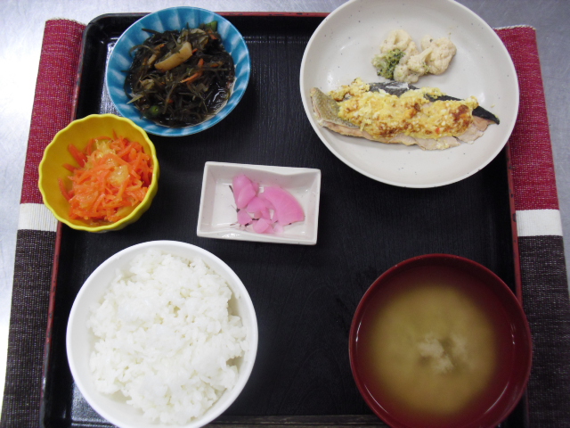 ◇御飯 ◇味噌汁 ◇鮭のタルタル焼き ◇刻み昆布煮 ◇はちみつ人参マリネ ◇しそ桜