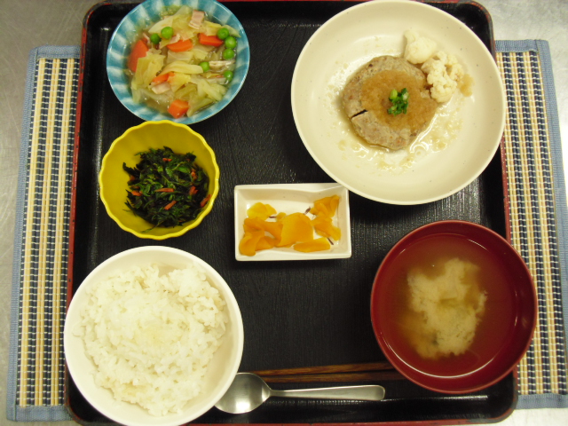 ◇御飯 ◇味噌汁 ◇和風ハンバーグ ◇キャベツとベーコンのスープ煮 ◇ほうれん草とひじきの和え物 ◇つぼ漬