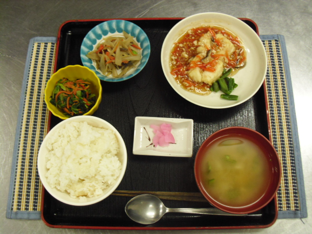 ◇御飯 ◇味噌汁 ◇揚げ豆腐のそぼろあん ◇五目金平 ◇小松菜のお浸し ◇しそ桜