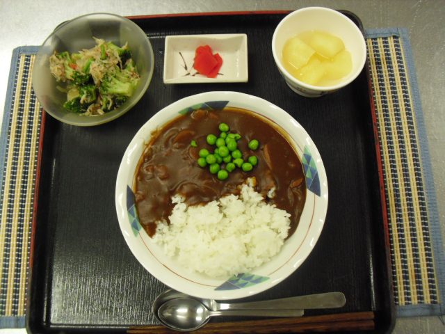 ◇ハヤシライス ◇かにかまのサラダ ◇福神漬 ◇りんごコンポート