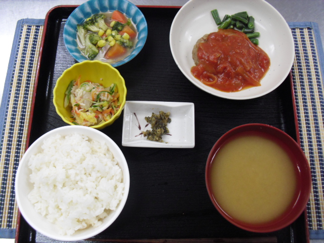◇御飯 ◇味噌汁 ◇ハンバーグトマトソース ◇ブロッコリーと野菜のスープ煮 ◇ぽん酢和え ◇刻み胡瓜漬