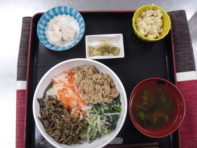 ◇ビビンバ丼 ◇スープ ◇かにしゅうまい ◇カリフラワーとツナの和え物 ◇ザーサイ