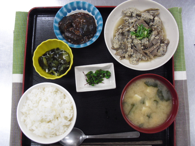 ◇御飯 ◇味噌汁 ◇あさりの柳川風煮 ◇麻婆茄子 ◇わかめの酢の物 ◇しその実漬