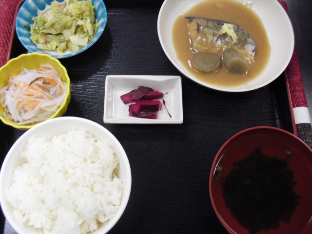 ◇御飯 ◇すまし汁 ◇サバの味噌煮 ◇キャベツのおかか炒め ◇春雨の酢の物 ◇しば漬