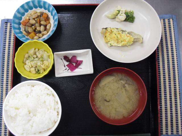 ◇御飯 ◇味噌汁 ◇たらのタルタル焼き ◇五目煮 ◇胡麻酢和え ◇しば漬