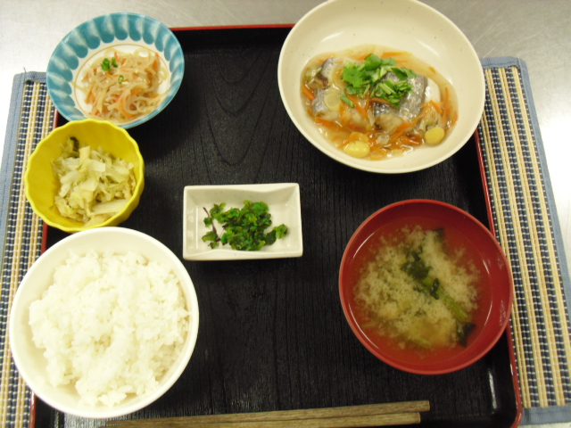 ◇御飯 ◇味噌汁 ◇太刀魚のさらさ蒸し ◇しらたきの炒り煮 ◇胡麻酢和え ◇しその実漬