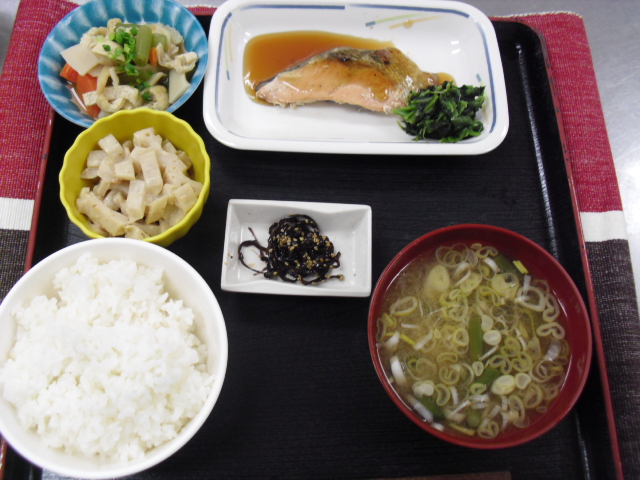 ◇御飯 ◇味噌汁 ◇鮭の照り焼き ◇信田煮 ◇レンコンとハムの和え物 ◇昆布佃煮