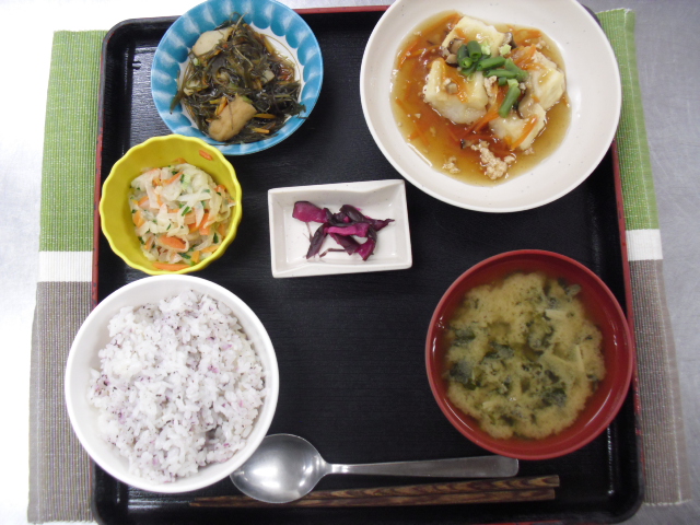 ◇ゆかり御飯 ◇味噌汁 ◇揚げ豆腐のそぼろあん ◇刻み昆布煮 ◇大根とにらのナムル ◇しば漬