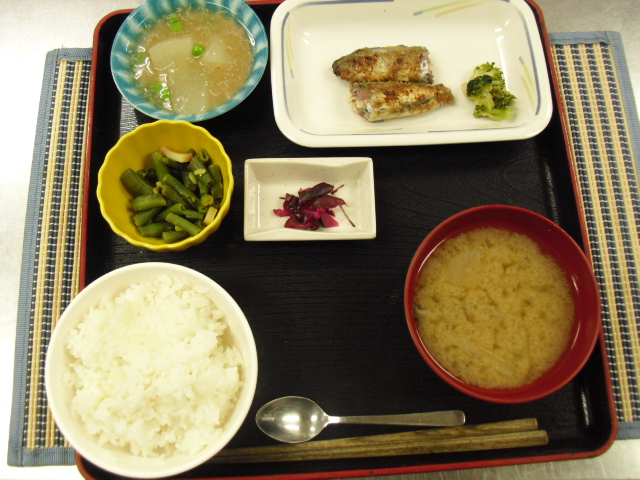 ◇御飯 ◇味噌汁 ◇秋刀魚の漬け焼き ◇冬瓜の含め煮 ◇辛子和え ◇しば漬