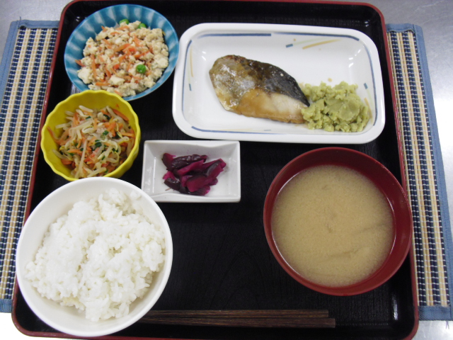◇御飯 ◇味噌汁 ◇さわらの生姜焼き ◇炒り豆腐 ◇もやしとにらのナムル ◇しば漬