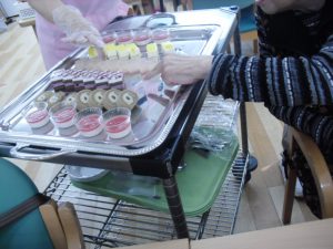 毎回好評のお楽しみおやつです。 今回は ◇ブルーベリーケーキ ◇日向夏ケーキ ◇ほうじ茶ロールケーキ ◇いちごムース◇白桃羹 の5種類の中からお好きなものを3種類選んで召し上がっていただきました。 一番人気はいちごムースでした。