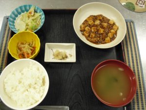 本日のメニュー ◇御飯 ◇スープ ◇麻婆豆腐 ◇野菜炒め ◇中華和え ◇ザーサイ エネルギー 610kcal