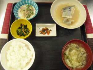 本日のメニュー ◇御飯 ◇味噌汁 ◇さば味噌煮 ◇春雨炒め ◇小松菜辛子和え ◇赤きゅうり エネルギー 605kcal