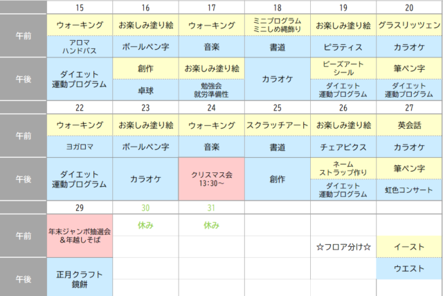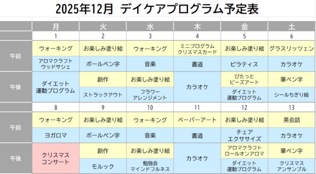 寒い季節こそ、あたたかい交流を大切に…。デイケアは年内12月29日(月)が最終日です。年明けは1月5日(月)からとなります!皆さまのご参加を心よりお待ちしております。