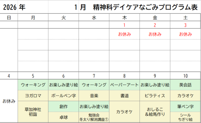 精神科デイケアでは、2025年1月のプログラム表を掲載いたしました。寒さが厳しくなる季節ですが、心と体の健康を保ちながら、楽しく過ごしていきましょう。