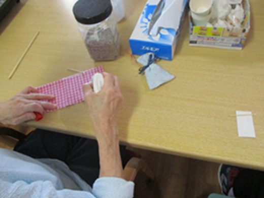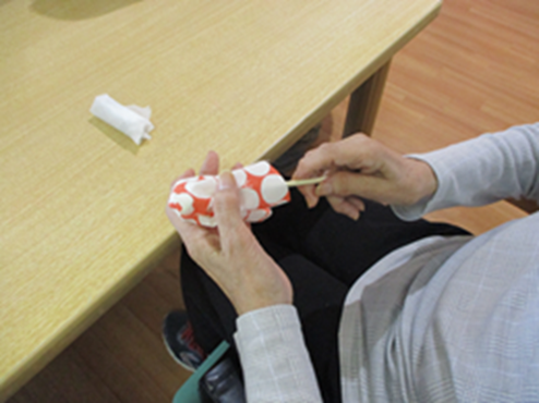 まず袋の布の柄を選んでもらい、ボンドを使って袋状にします。
