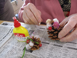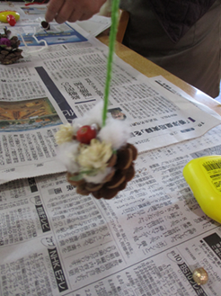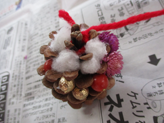 松ぼっくりに綿や色とりどりの飾りを付けていきます☆
