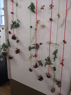 葉っぱや木の実を間に結ぶと、さらにクリスマス感がアップしました!