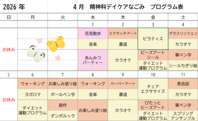 みなさんこんにちは。精神科デイケアなごみです。4月のデイケアプログラムが完成しました。